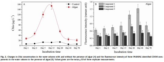 數(shù)據(jù)內容:Chla濃度在藻華處理中從第1天27.6 μg L?1增至第15天154.3 μg L?1,之后下降至第70天14.3 μg L?1;CDOM組分(如色氨酸類熒光團)在崩潰期增加。