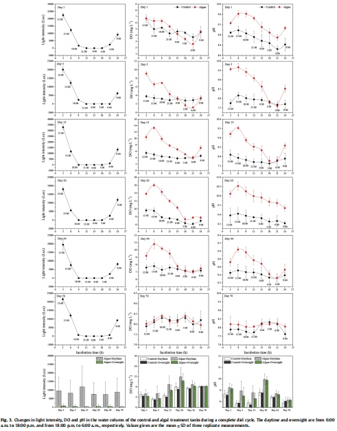 數(shù)據(jù)內容:光強、DO和pH呈現(xiàn)晝夜波動,DO白天高(峰值13.3 mg L?1)、夜間低(最低1.5 mg L?1),pH白天高(峰值10.53)、夜間低。
