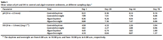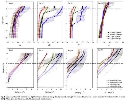 數(shù)據(jù)內容:藻華處理中,表層沉積物(0至-2.5 mm)pH白天高(9.26)、夜間低(7.36),DO白天高(6.74 mg L?1)、夜間低(0.84 mg L?1);受影響深度達-20 mm(pH)和-3.5 mm(DO)。