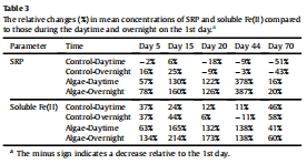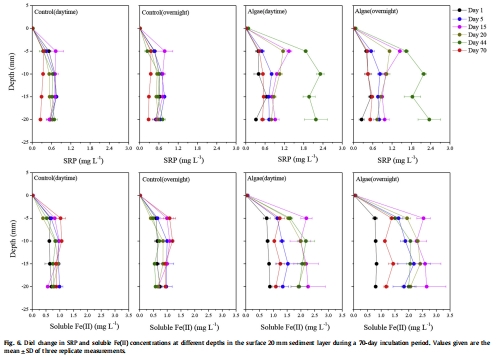 數(shù)據(jù)內容:藻華處理中SRP和可溶性Fe(II)濃度增加,第44天SRP最大增加387%(夜間),第15天可溶性Fe(II)最大增加214%(夜間);夜間濃度普遍高于白天。