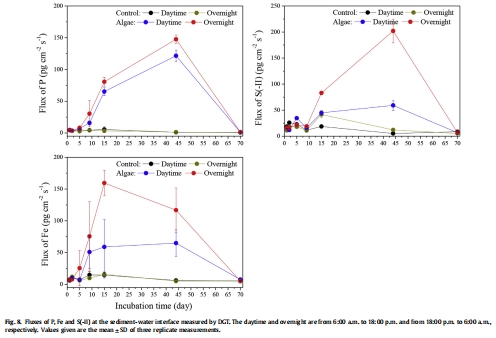 數(shù)據(jù)內容:藻華處理中P、Fe和S(-II)通量增加,第44天通量最高,夜間通量一般高于白天。