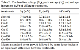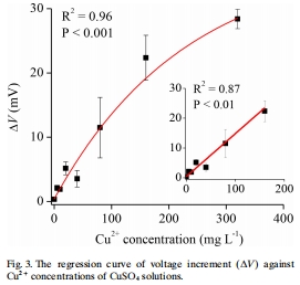 數據:Cu2?加入后電壓30秒內達峰值,增量(ΔV)隨濃度升高而增大(Cu-320處理ΔV=28.4 mV)。ΔV與Cu2?濃度(≤160 mg/L)呈線性關系(R2=0.96)(圖3)。