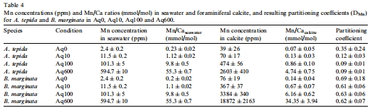 海水與方解石Mn/Ca比率(數據來自Table 2 和 Table 4):