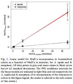 數據:海水Mn/Ca范圍0.23–55.3 mmol/mol;方解石Mn/Ca范圍:A. tepida為0.07–4.74 mmol/mol,B. marginata為0.14–34.35 mmol/mol。