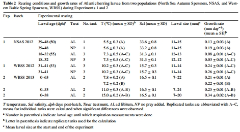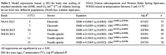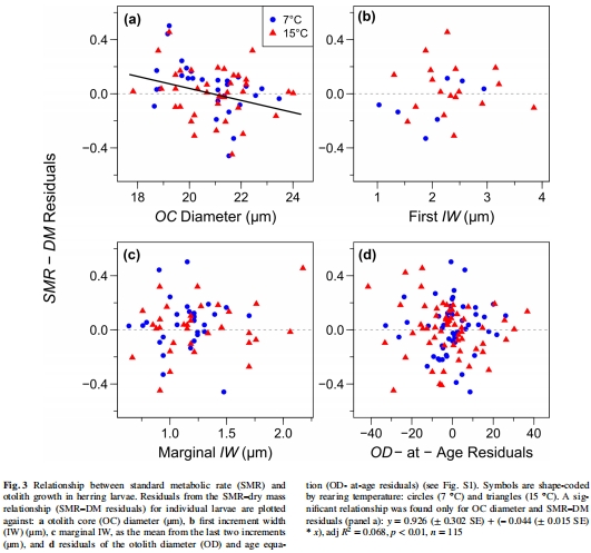 在充分喂養的幼蟲中,SMR與短期(耳石邊緣增量寬度)或長期(體型大小、耳石直徑)生長指標無關,但與耳石核心直徑(孵化至首次攝食期間形成)呈負相關。