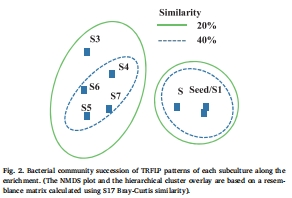數據:TRFLP分析顯示,從傳代1到3(S1-S3)群落結構變化顯著,S4-S7群落相似性高,表明富集在28天(4次傳代)后穩定。