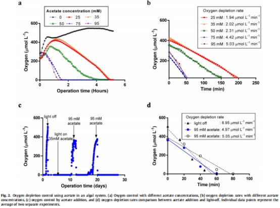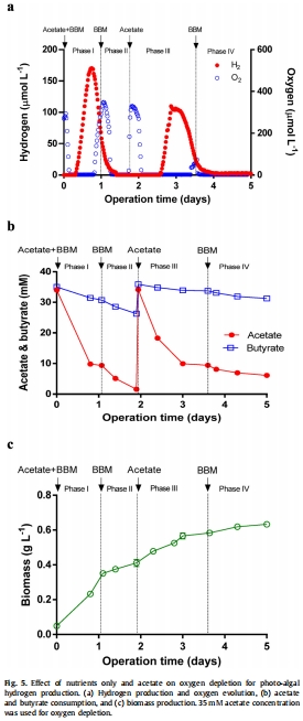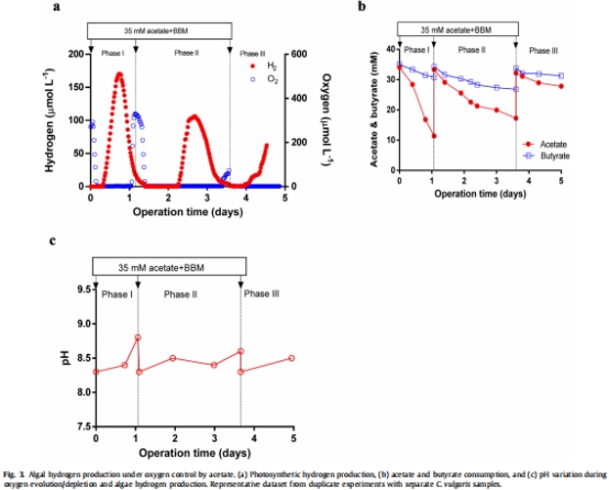 數據:僅添加營養(BBM)無乙酸時,氧耗竭緩慢且無產氫;添加乙酸后立即產氫。