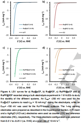 研究通過兩種碳纖維(原始pCF和功能化fCF)和兩種Ru NPs合成方法(原位in-situ和異位ex-situ),制備了四種混合陰極材料:Ru@pCF、Ru@fCF、RuPP@pCF和RuPP@fCF(其中RuPP表示用4-苯基吡啶穩定的Ru NPs)。在酸性條件(1 M H2SO4)下測試HER性能,發現異位合成的Ru NPs(RuPP@xCF)具有更低的起始過電位(接近0 mV)和更高的活性。穩定性測試表明,RuPP@pCF在2小時電解后保持95%的活性,而其他系統活性下降較多。功能化碳纖維(fCF)的羧基可能阻礙配體與碳表面的π-相互作用,降低穩定性。總體而言,異位合成且使用pCF的系統(RuPP@pCF)在活性和穩定性方面表現最佳,為高效HER催化劑設計提供了新思路。