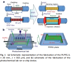 研究設計了一種新型光化學酚傳感器,通過將薄化長周期光纖光柵(LPFG)與紫外-可見光驅動的Er3?:YAlO?/SiO?/TiO?(EYST)涂層結合形成PLPFG,并集成高酚選擇性聚合物膜(PEBA2533摻雜β-環糊精)、Z形微通道和錐形紫外光纖陣列,實現了對水溶液中酚的高選擇性、高靈敏度檢測。該傳感器在寬濃度范圍(7.5 μg L?1至100 mg L?1)、寬pH范圍(2.0–14.0)和寬溫度范圍(10–48°C)內均表現優異,靈敏度達-0.0492 nm (mg L?1)?1,檢測限為7.5 μg L?1,響應時間約395秒。FBG用于溫度補償,確保測量準確性。該裝置為酚的實時、在線檢測提供了新方案。