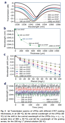 數據:EYST涂層厚度影響靈敏度——200 nm厚度時靈敏度最高(-0.0227 nm (mg L?1)?1, R2=0.993);500 nm厚度在紫外光驅動下最佳(-0.0492 nm (mg L?1)?1)。