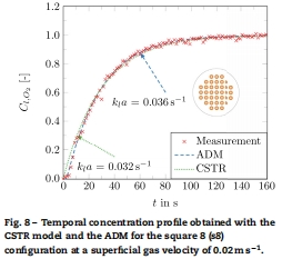 數據關聯:結合ADM模型(Eq. 6)擬合氧濃度曲線,計算kLa和kL(如Fig. 9);結果顯示內部構件降低kL(湍流阻尼),但界面面積補償部分損失。