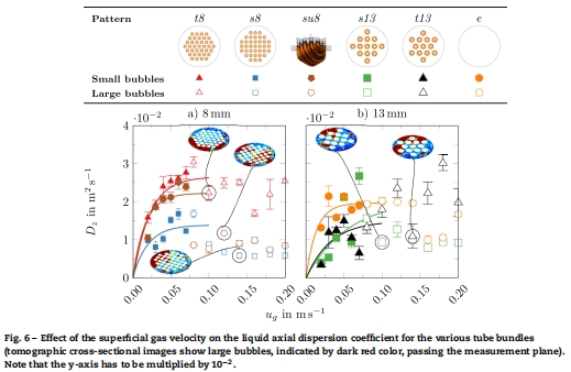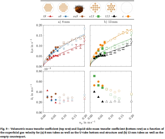 定量評估管束設計對傳質的影響:研究不同管排列(三角形/方形)、管徑(8 mm/13 mm)和底部設計(平底/U型管)如何影響氣體-液體傳質系數(kLa)和液體分散。