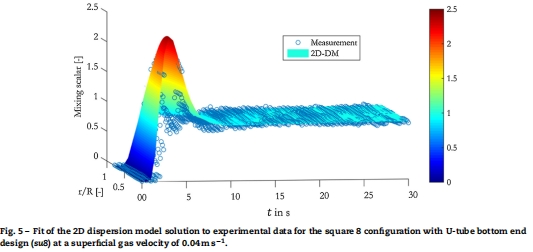 驗證2D分散模型:評估二維分散模型(2D-DM)在預測含內部構件氣泡柱中液體分散的可靠性,與傳統軸向分散模型(ADM)對比。