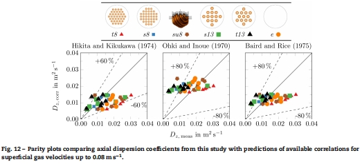 數據:現有關聯式(如Ohki-Inoue對Dz,l)對空柱預測良好,但低估內部構件影響;Letzel關聯式(kLa=0.5εg)與數據吻合較好。