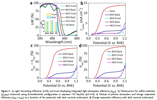數(shù)據(jù):背光照射下,MJ3的ηabs為94.0%,ηabs × ηsep在0.5和1.23 V vs. RHE時分別為74.5%和93.0%;ηsep高達98.9%(1.23 V)。