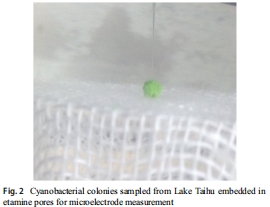 采樣與準(zhǔn)備:從太湖梅梁灣表層水采集藍(lán)藻菌落(主要物種微囊藻),選擇直徑2±0.1 mm的健康菌落,固定于尼龍網(wǎng)(Fig. 2)。