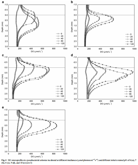 數(shù)據(jù):菌落核心DO隨光照增加而升高(如初始pH 9時(shí),DO從黑暗~100 μmol L?1增至120 μmol photons m?2 s?1時(shí)~1000 μmol L?1);初始pH 9時(shí)DO最高,pH 6時(shí)光抑制現(xiàn)象(120 μmol時(shí)DO下降)。