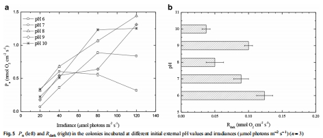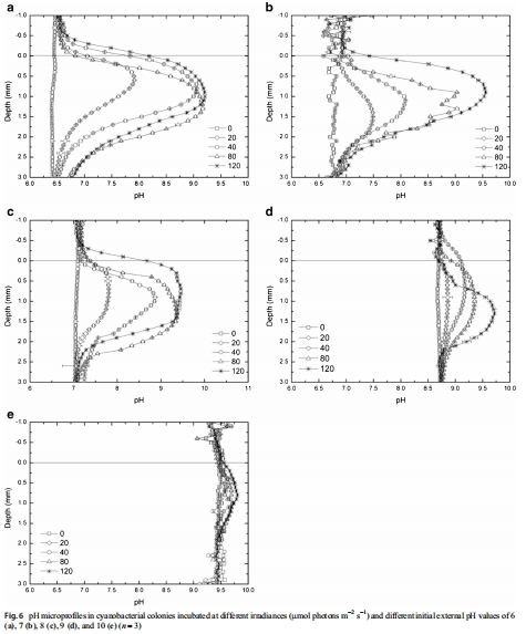 數(shù)據(jù):菌落核心pH隨光照增加而上升(如初始pH 6時(shí),pH從黑暗~6.5增至光照~9.2);初始pH 10時(shí)變化最小,但最高pH達(dá)9.8。