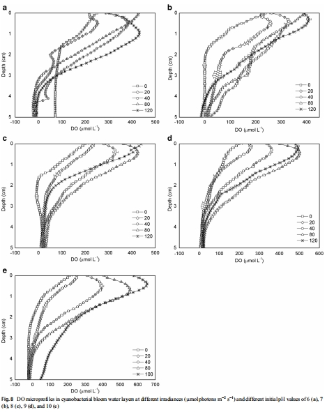 數(shù)據(jù):靜止水華層表層DO和pH最高(如初始pH 10時(shí),DO~653 μmol L?1,pH~10.5),深度3-4 cm處DO降至0,形成厭氧區(qū)。