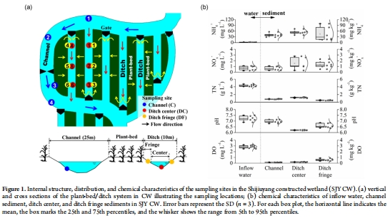 現場設計:在SJY CW中,通過調節水泵系統實現水位周期性波動(30-40 cm,每日兩次),形成氧化-還原交替的異質環境(溝渠邊緣、中心及渠道)。采樣點包括渠道(高流速)、溝渠中心(中流速)和溝渠邊緣(低流速),如圖1所示。