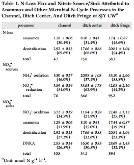 數據:在溝渠邊緣,anammox貢獻43.0%氮損失和44.4%銨去除;亞硝酸鹽來源中,銨氧化占55.8%,硝酸鹽還原占44.2%。