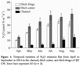 數據:溝渠邊緣N2O通量(24.7 μmol/m2/h)低于溝渠中心(33.9 μmol/m2/h),熱點區域N2O排放減少27.1%。