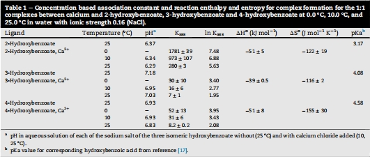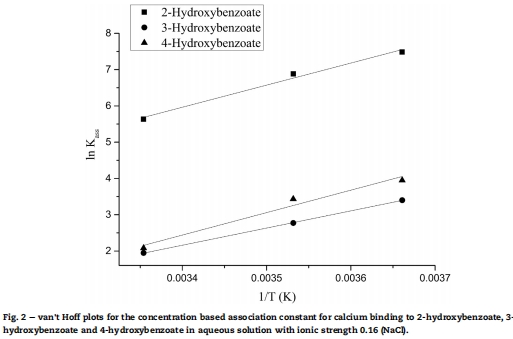 研究意義:2-異構(gòu)體結(jié)合最強(qiáng)歸因于螯合效應(yīng)(酚羥基與羧酸鹽協(xié)同),如Fig. 1所示;溫度升高降低K_ass,表明結(jié)合為放熱過程。這解釋了鈣對抗氧化活性的差異化影響。
