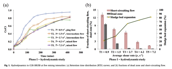 1 測量了反應器流體力學數據,包括保留時間分布曲線、短路流比例和死區體積,數據來自Fig. 1。研究意義是評估混合效率,表明CGR混合在4.2 s?1下能實現最小短路流(1.3±0.1%)和死區(0.2±0.01%),優化反應器內部流動,提高處理效率。