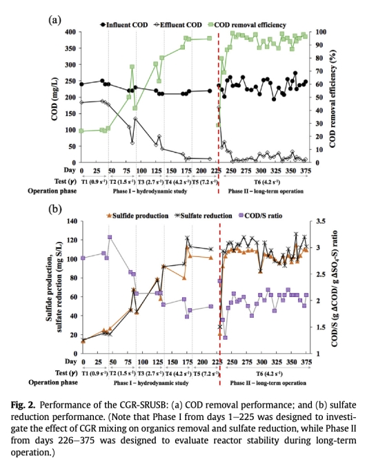 2 測量了有機物去除和硫酸鹽還原性能,如COD去除效率和硫酸鹽還原量,數據來自Fig. 2。研究意義是驗證CGR混合能提高反應器性能,在最佳混合強度下COD去除效率超過90%,硫酸鹽還原量高,表明硫酸鹽還原菌活性增強。
