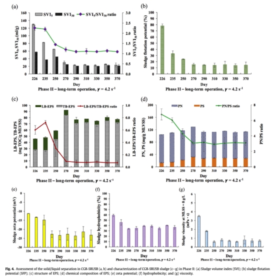 4 測量了污泥沉降性和浮選潛力,如污泥體積指數和污泥浮選潛力,數據來自Fig. 4a和Fig. 4b。研究意義是評估固體-液體分離特性,顯示CGR混合能維持低SVI(<30 mL/g)和低SFP(<20%),防止污泥浮選,增強操作穩定性。