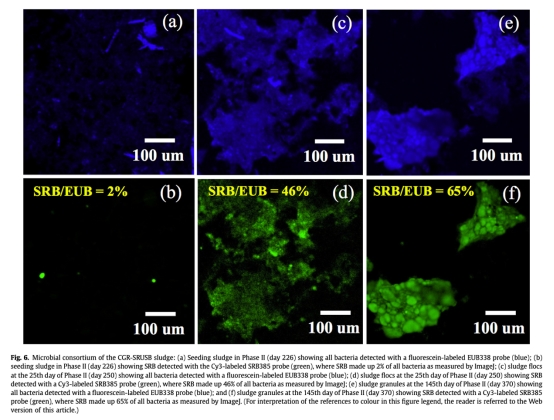 5 測量了污泥顆粒大小和生長率,數據來自Fig. 5a和Fig. 5f。研究意義是跟蹤顆?;^程,表明在65天內形成微顆粒(300-350 μm),生長率逐漸降低,有助于理解顆粒形成動力學。