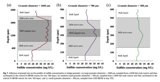 9 測量了硫化物濃度在污泥顆粒內的剖面使用丹麥Unisense微傳感器,數據來自Fig. 7。研究意義是評估質量傳遞,顯示小顆粒中硫化物濃度梯度低,表明質量傳遞阻力小,底物滲透深。