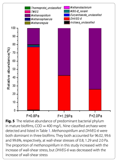 3 測量了微生物群落組成,數據來自Fig. 5和Table 1。研究意義是分析古菌物種豐度,顯示Methanospirillum和DHVEG-6為優勢種,但比例隨剪切應力變化,例如Methanospirillum在2.0 Pa時占78.84%,表明剪切應力影響產甲烷菌活性。