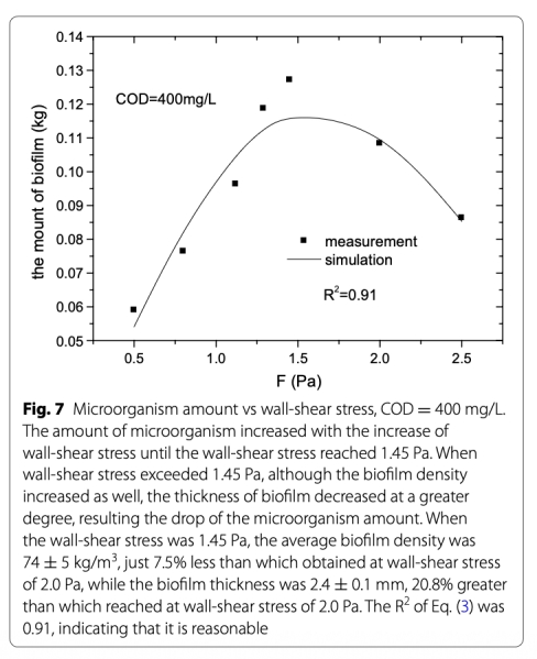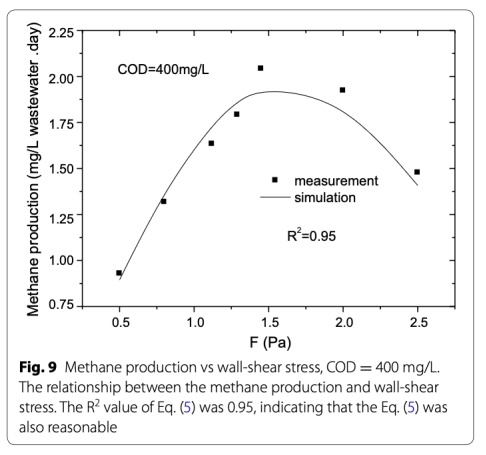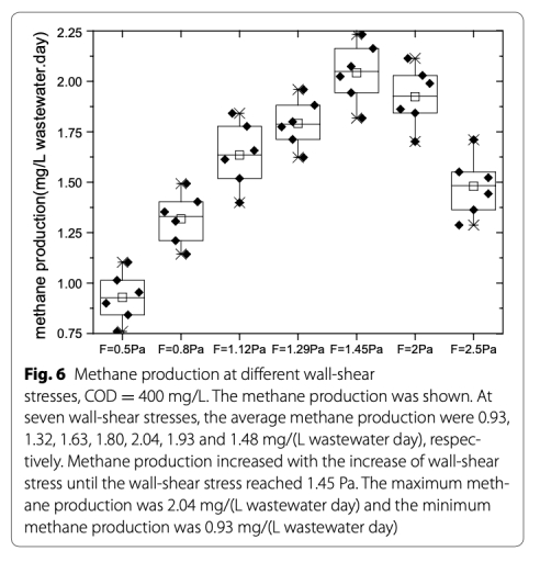 4 測量了甲烷產量,數據來自Fig. 6和Fig. 9。研究意義是量化甲烷產率,顯示在1.45 Pa時最大(2.04 mg/L wastewater day),驗證剪切應力優化可增強甲烷形成,為模型提供關鍵參數。