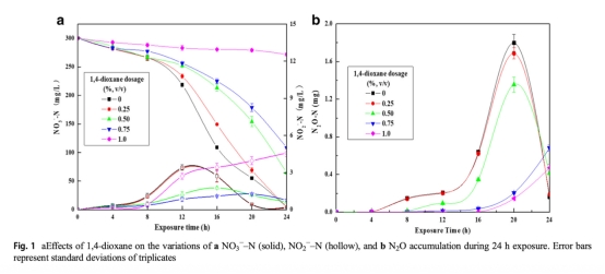 1. 數(shù)據(jù):NO3-N、NO2-N和N2O的濃度變化 during 24小時暴露。來源:Fig.1a 和 Fig.1b。研究意義:這些數(shù)據(jù)直接顯示1,4-二氧六環(huán)劑量依賴性地抑制反硝化過程,高劑量導致硝酸鹽還原延遲、亞硝酸鹽積累和氧化亞氮生成增加,表明反硝化步驟被干擾,有助于評估污染物對氮循環(huán)的實時影響。