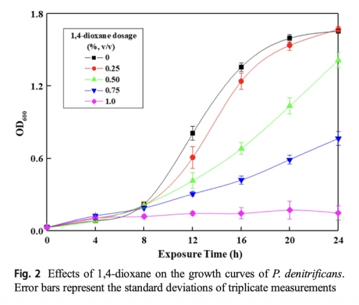 2. 數(shù)據(jù):P. denitrificans的生長曲線(OD600值)。來源:Fig.2。研究意義:生長曲線數(shù)據(jù)表明1,4-二氧六環(huán)抑制細胞增殖,高劑量時生長完全受阻,這解釋了反硝化效率下降的部分原因,因為微生物數(shù)量減少直接削弱代謝能力。