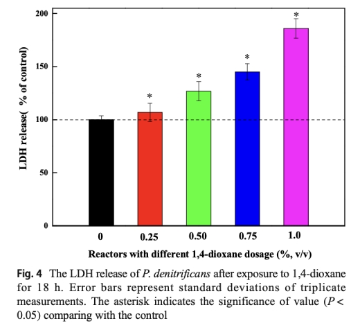4. 數(shù)據(jù):LDH釋放量作為細胞膜完整性指標。來源:Fig.4。研究意義:LDH數(shù)據(jù)表明1,4-二氧六環(huán)破壞細胞膜,導致胞內(nèi)物質(zhì)泄漏,這解釋了活力下降的機制,強調(diào)了污染物對微生物結(jié)構(gòu)完整性的損害,為理解其生物毒性提供了細胞層面證據(jù)。