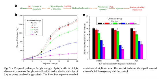 5. 數(shù)據(jù):葡萄糖利用量變化。來源:Fig.5b。研究意義:葡萄糖利用數(shù)據(jù)反映碳代謝被抑制,高劑量1,4-二氧六環(huán)減少碳源消耗,表明微生物能量代謝受損,這間接影響反硝化所需的電子供應,連接了碳循環(huán)與氮循環(huán)的相互作用。