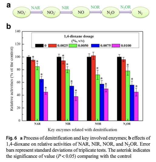 6. 數(shù)據(jù):關鍵酶活性,包括糖酵解酶(HK、PFK、GAPDH)和反硝化酶(NAR、NIR、NOR、N2OR)。來源:Fig.5c 和 Fig.6b。研究意義:這些酶活性數(shù)據(jù)直接顯示1,4-二氧六環(huán)抑制代謝和反硝化關鍵步驟,酶活性下降是反硝化效率降低的直接原因,突出了污染物對分子水平功能的干擾,為開發(fā)緩解策略提供靶點。