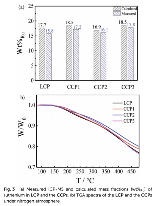 1 數(shù)據(jù):FTIR光譜、固體狀態(tài)13C-NMR光譜、ICP-MS測定的Ru含量、TGA熱穩(wěn)定性分析,來自Fig.2和Fig.3。研究意義:這些數(shù)據(jù)驗證了聚合物的成功合成和結(jié)構(gòu)完整性,F(xiàn)TIR和NMR確認(rèn)官能團(tuán),ICP-MS定量Ru摻入,TGA顯示熱穩(wěn)定性,為催化劑基礎(chǔ)性能提供依據(jù)。