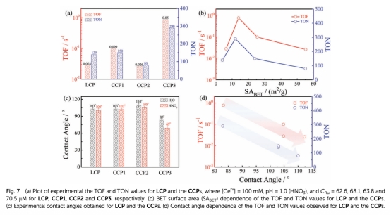 3 數(shù)據(jù):氧氣演化曲線、初始氧氣演化速率(vi)與催化劑濃度(CRu)的關(guān)系、TOF和TON值,來自Fig.6和Fig.7。研究意義:氧氣傳感器監(jiān)測實時氧氣濃度,動力學(xué)數(shù)據(jù)顯示準(zhǔn)一級反應(yīng),支持WNA機(jī)制;TOF和TON比較催化性能,表明CCP3最優(yōu),界面潤濕性(接觸角)是關(guān)鍵因素。