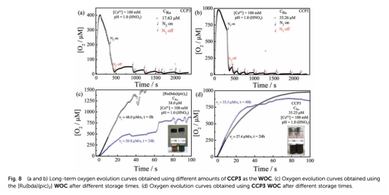 4 數(shù)據(jù):長期氧氣演化曲線、存儲穩(wěn)定性測試,來自Fig.8。研究意義:長期實驗顯示催化劑穩(wěn)定性,CCP3在存儲后活性增強(qiáng),表明三維交聯(lián)結(jié)構(gòu)防止自氧化和配體解離,提升耐久性。