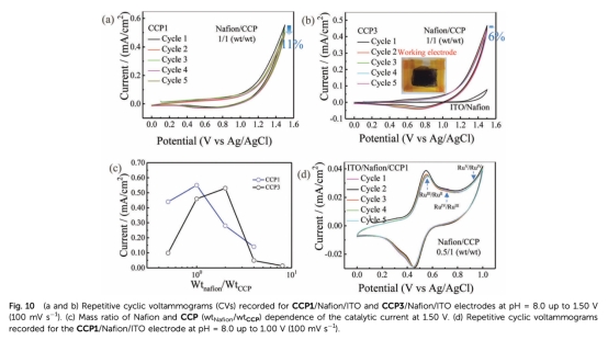 5 數(shù)據(jù):循環(huán)伏安圖(CVs)、電催化電流,來自Fig.10。研究意義:電化學(xué)測試顯示催化劑在電極上的活性和穩(wěn)定性,CCP/Nafion/ITO電極在多次循環(huán)后保持活性,證明其適合電催化應(yīng)用。