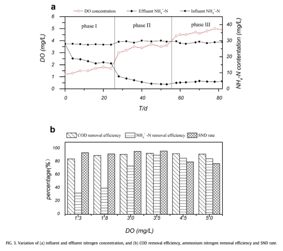 1 數(shù)據(jù):氮濃度變化和SND率,來自Fig.3。研究意義:Fig.3a和Fig.3b顯示不同DO階段下進(jìn)水出水氮濃度及去除效率,表明DO 3.5 mg/L時(shí)SND率最高(96%),證實(shí)DO調(diào)控能優(yōu)化硝化和反硝化平衡,為反應(yīng)器操作提供關(guān)鍵參數(shù)。