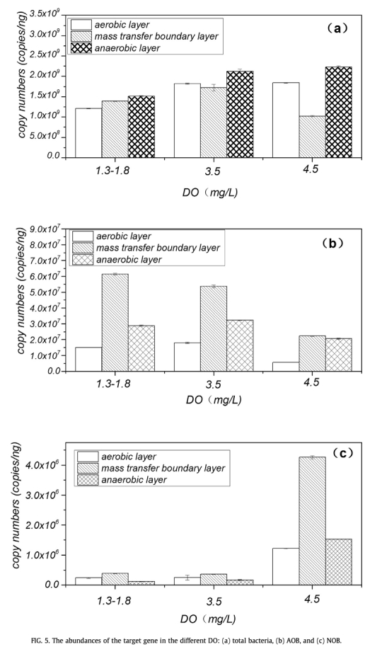 3 數(shù)據(jù):AOB和NOB數(shù)量變化,來自Fig.5。研究意義:Fig.5a-c通過實(shí)時(shí)PCR顯示總細(xì)菌、AOB和NOB的拷貝數(shù),DO 3.5 mg/L時(shí)AOB數(shù)量最高,表明中等DO促進(jìn)硝化細(xì)菌生長,鏈接到SND效率提升,指導(dǎo)菌群調(diào)控策略。