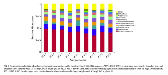 摘要部分闡述了本研究在序批式生物膜反應(yīng)器(SBBR)中調(diào)查了溶解氧濃度(DO)對(duì)同步硝化反硝化(SND)過程中生物膜微生物群落的影響。實(shí)驗(yàn)在不同DO濃度(1.5、3.5和4.5 mg/L)下進(jìn)行,評(píng)估氮去除率和細(xì)菌群落變化。當(dāng)DO為2.5 mg/L時(shí),SND率最高達(dá)95.22%,化學(xué)需氧量(COD)和氮去除率分別為92.22%和84.15%。反硝化過程隨氧濃度增加而受抑制。微電極測(cè)量顯示,DO濃度從1.5 mg/L增至5.5 mg/L時(shí),氧滲透厚度從1.0 mm增至2.7 mm。高通量測(cè)序分析表明,生物膜群落結(jié)構(gòu)相似,以Uliginosibacterium、Zoogloea和Acinetobacter為主。好氧層以Betaproteobacteria和Saprospirae為主,厭氧層以Anaerolineae為主。實(shí)時(shí)PCR顯示氨氧化細(xì)菌(AOB)和亞硝酸鹽氧化細(xì)菌(NOB)數(shù)量與Nitrospirales和Nitrosomonadales豐度匹配。研究表明DO濃度顯著影響SND系統(tǒng)中關(guān)鍵細(xì)菌群落的動(dòng)態(tài)。