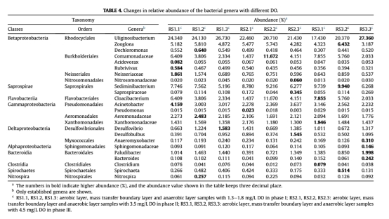 4 數(shù)據(jù):微生物群落組成在門和綱水平分布,來自Fig.6和Table 4。研究意義:Fig.6展示不同DO下群落相對(duì)豐度,好氧層Betaproteobacteria占主導(dǎo),厭氧層Anaerolineae增多,Table 4列出屬水平細(xì)節(jié)(如Uliginosibacterium豐度最高),證實(shí)DO驅(qū)動(dòng)群落演替,影響系統(tǒng)穩(wěn)定性。