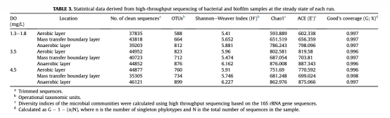 5 數(shù)據(jù):生態(tài)多樣性指數(shù)(如Shannon指數(shù)、Chao1),來自Table 3。研究意義:Table 3提供OTU數(shù)量和多樣性指標(biāo),顯示厭氧層多樣性最高,表明低DO促進(jìn)物種豐富度,有助于評(píng)估生物膜抗逆性。