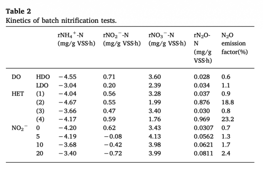 2 數(shù)據(jù):反硝化過程中的氮去除速率和N2O排放因子,來自Table 3。研究意義:數(shù)據(jù)顯示外源碳(乙酸鈉)反硝化速率(6.42 mg N/g VSS·h)高于內(nèi)源碳(PHB)反硝化(3.88 mg N/g VSS·h);亞硝酸鹽反硝化的N2O排放因子(3.7-4.7%)高于硝酸鹽反硝化(2.2-1.7%);一次性投加模式的N2O積累高于連續(xù)投加模式,表明投加方式影響N2O還原酶抑制程度。