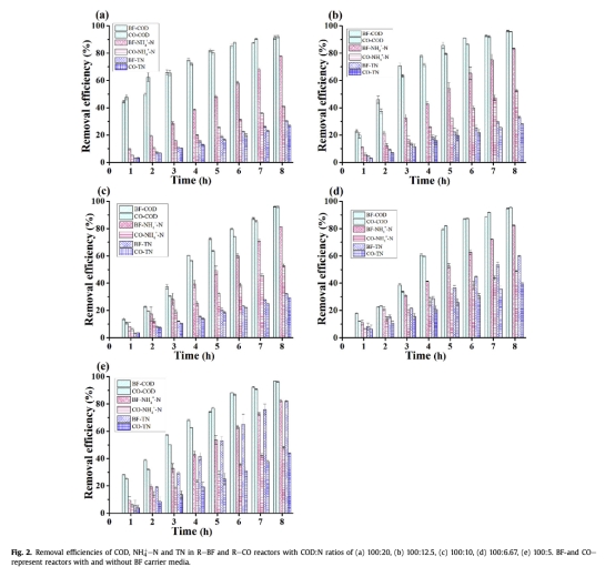 1 數據:COD、NH4-N和TN的去除效率,來自Fig.2。研究意義:這些數據顯示R-BF反應器在所有COD:N比下均能高效去除COD(超90%),且氮去除率顯著高于R-CO反應器(最高TN去除率82.07%),證明BF載體能增強同步硝化反硝化能力,為廢水處理提供更高效的生物膜系統。